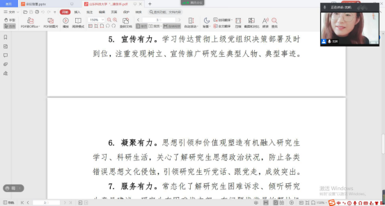 为进一步规范党支部的组织生活,提高支部党员的理论学习水平,深入推进“研究生样板党支部”的培育创建工作,确保党员队伍放假“不掉线”。1月28日下午,土建学院研究生第一党支部通过腾讯会议线上召开支部大会,集中组织学习了“灯塔大课堂”第十七讲,并就“研究生样板党支部”的创建工作作了动员,研究生第一党支部全体党员、学工办老师沈娇及部分入党积极分子代表参与了本次会议,会议由党支部书记韩一鸣主持。