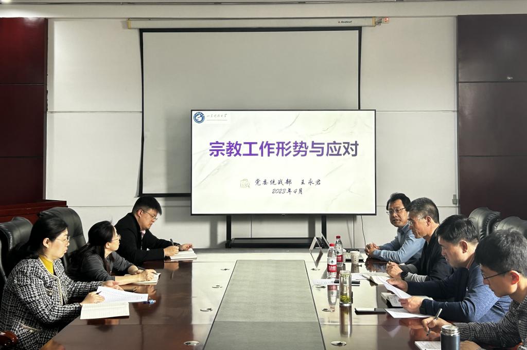 4月18日,土建学院党委理论学习中心组(扩大)开展2023年第六次集体学习,学校党委统战部常务副部长、台港澳工作办公室主任王永君应邀作《宗教工作形势与应对》专题报告。会议由学院党委书记宋西路主持。学院党委理论学习中心组、全体党支部书记、教工党支部支委委员、系所中心主任、科室负责人参加了会议。