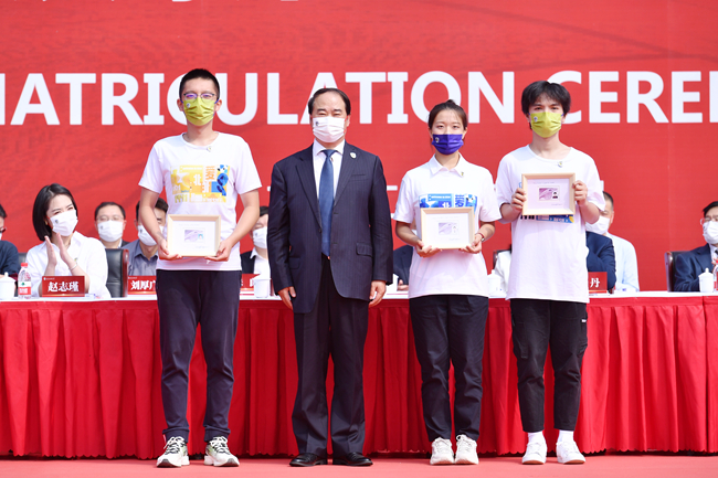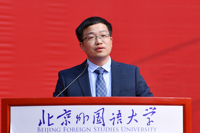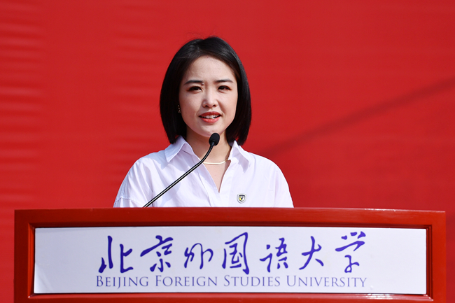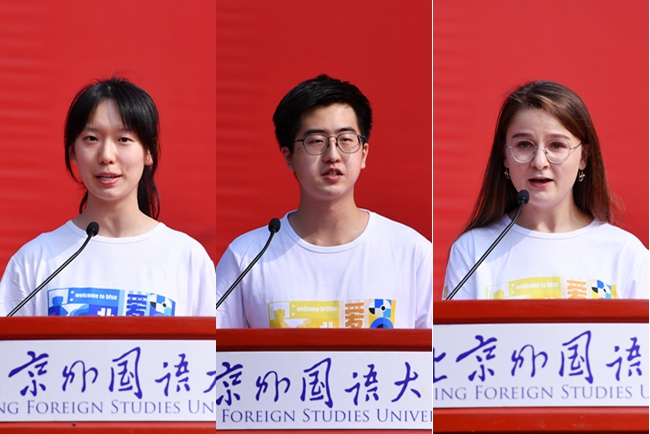 本科新生代表日语学院日语专业李子乐号召同学们以全新的面貌开启人生新旅程,希望和同学们携手奋进,做有理想、有本领、有担当的北外人。英语学院英语笔译专业政治文献翻译方向首届新生、研究生新生代表李泽晖同学倡导同学们要“游于语言,依于北外,据于中国,志于世界”,将红色基因不断传承,在伟大事业中绽放光彩。留学生代表、中国语言文学学院博士生、来自白俄罗斯的格里沙耶娃(Hryshayeva Katsiaryna)希望努力践行“兼容并蓄、博学笃行”的校训精神,成为有真才实学的北外人,为增进中白友谊贡献自己的力量,希望和同学们一起为人类命运共同体建设做出更多贡献。