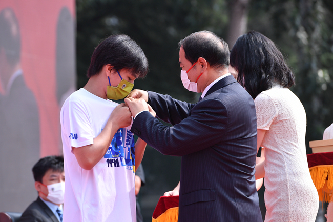 在神圣庄重的校徽佩戴仪式上,王定华为新生代表佩戴校徽、颁发新版北外校园卡。在场的全体新生同时佩戴校徽,正式成为北外人,成为北外大家庭的一员。