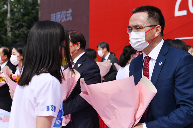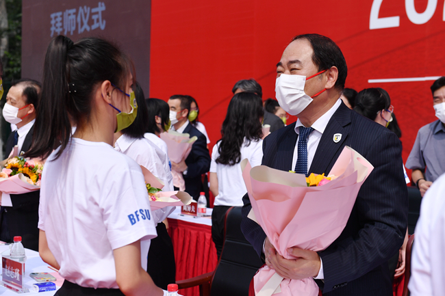 随后的新生拜师献花仪式上,新生代表向教师代表鞠躬并献上鲜花。学生代表带领全体学生集体宣读入学誓词:铭记兼容并蓄、博学笃行的北外校训,志存高远,勤学力行。敬师爱校、诚以待人。强健体魄、阳光向上。珍惜韶华,奋发有为。胸怀天下,敢于争先。不畏艰难,勇担使命。服务人民,奉献祖国。