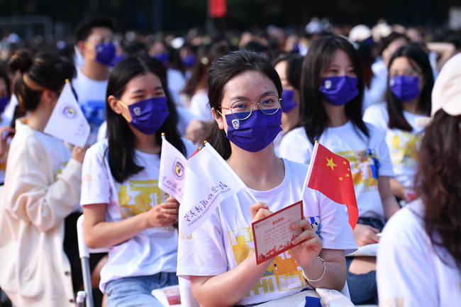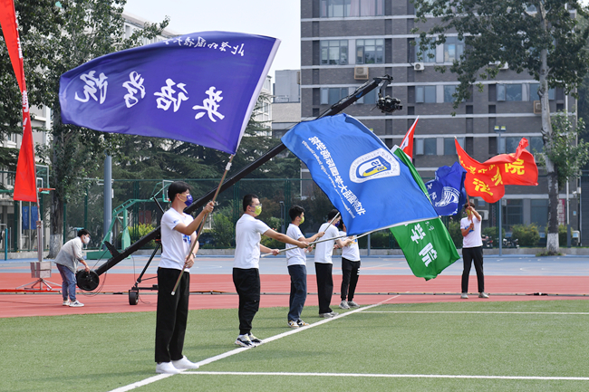 最后,校旗和各院院旗共同挥舞,开学典礼在一段精彩的快闪中、在学生自己创作的歌曲中落下帷幕。
