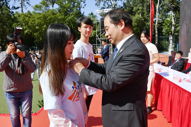 在神圣而庄重的校徽佩戴仪式上,王定华为新生代表佩戴校徽。在场的全体新生同时配带校徽,正式成为北外人,成为北外大家庭的一员。