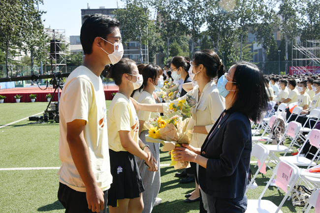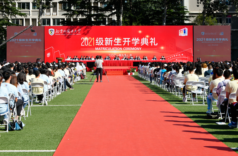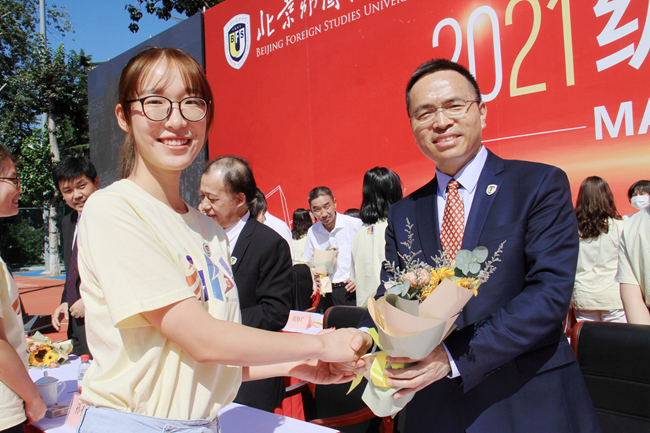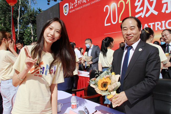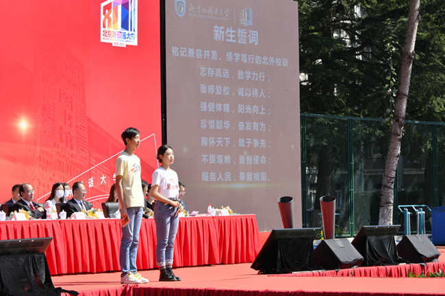 随后的新生拜师献花仪式上,新生代表向教师代表鞠躬并献上鲜花。学生代表带领全体学生集体宣读入学誓词:铭记兼容并蓄、博学笃行的北外校训,志存高远,勤学力行。敬师爱校、诚以待人。强健体魄、阳光向上。珍惜韶华,奋发有为。胸怀天下,敢于争先。不畏艰难,勇担使命。服务人民,奉献祖国。