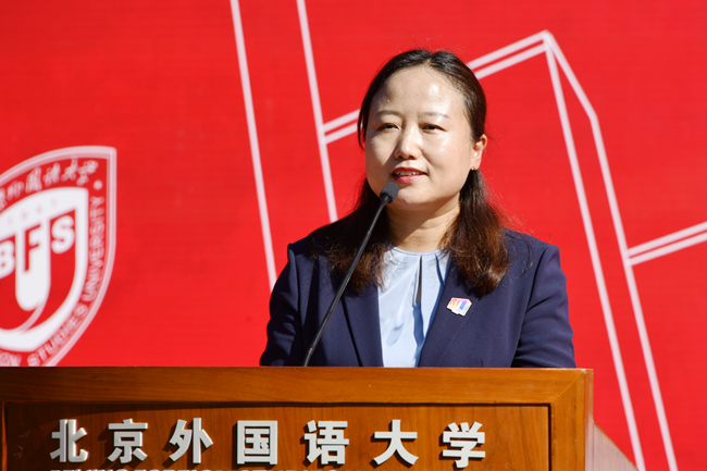 教师代表、专用英语学院党总支副书记、院长侯俊霞分享了藏族校友美朵刻苦学习外语,回乡后从事外语教学的感人故事,鼓励本科生苦练语言基本功,用语言探索世界;鼓励研究生用学术的语言,在国际舞台发出中国学者的声音;鼓励留学生仔细观察、用心感受,向世界讲述真心实意为构建人类命运共同体尽心尽力的中国。