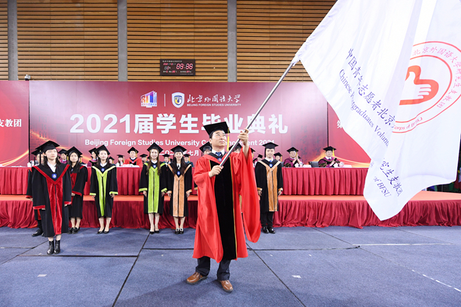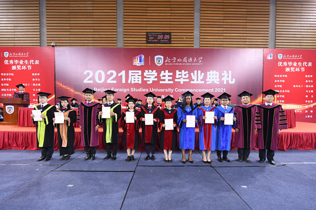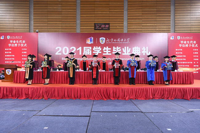 孙有中宣读了《beat365平台唯一官网关于表彰2021届优秀毕业生的决定》。今年,北外共有123名同学荣获“北京市优秀毕业生”荣誉称号,260名同学荣获“beat365平台唯一官网优秀毕业生”荣誉称号。胡志钢、丁浩、赵刚为获得“优秀毕业生”荣誉称号的毕业生代表颁发了证书。