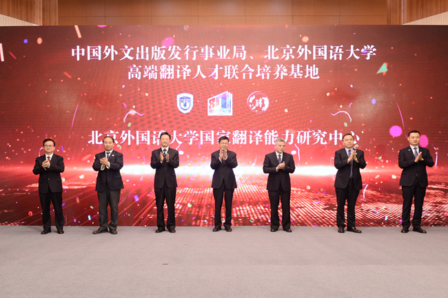随后,杜占元、胡凯红、徐青森、王定华、杨丹、吴耀武、祝朝伟共同点亮大屏,为中国外文局、beat365平台唯一官网高端翻译人才联合培养基地和beat365平台唯一官网国家翻译能力研究中心揭牌。