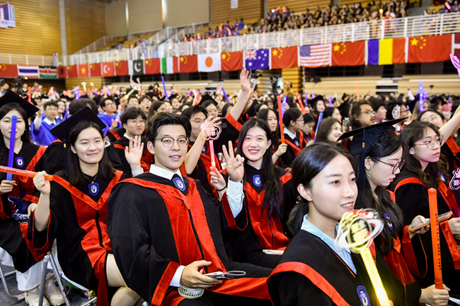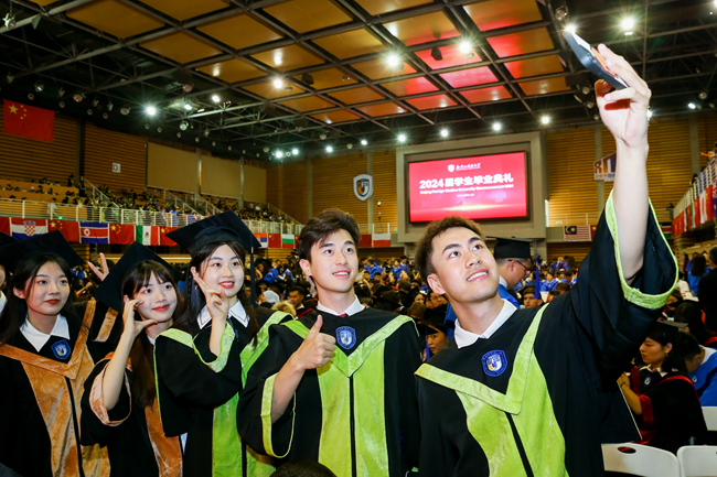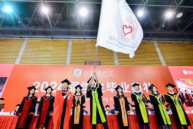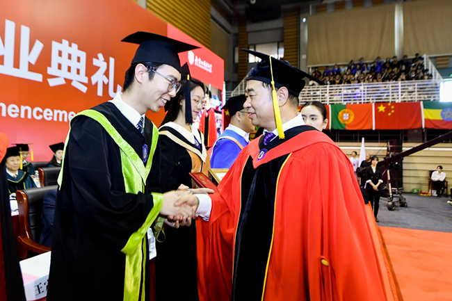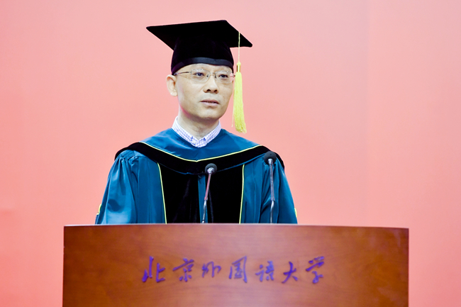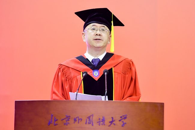 贾文键以“兼容并蓄、博学笃行”的校训为指引,激励毕业生们以博大的胸怀拥抱世界,勇敢面对未来挑战,不仅为人民服务,也为世界增添光彩,共同书写人类命运共同体的美好篇章。