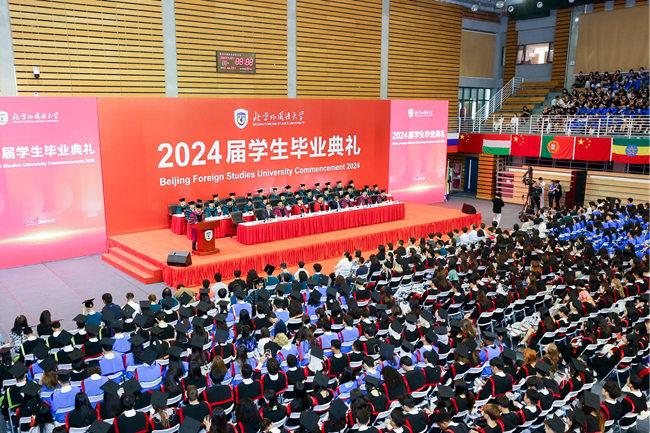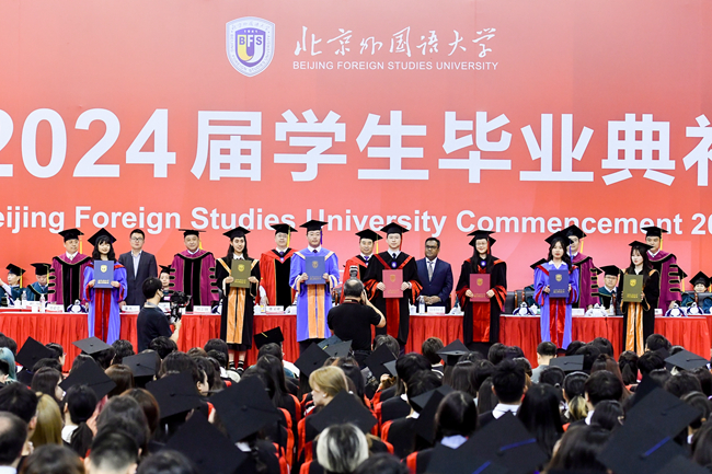 贾文键回顾了2024届毕业生在北外的学习历程,指出从国内大厦到国际大厦,从西三环北路到“一带一路”,从为公桥到人类命运共同体,北外学子能够以学校为出发点,将世界使命纳于心中。