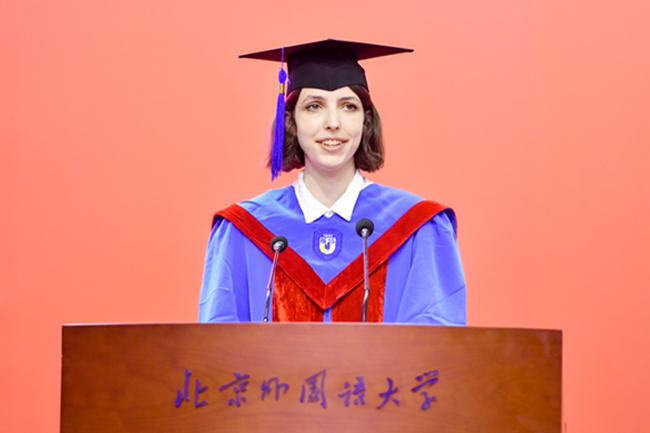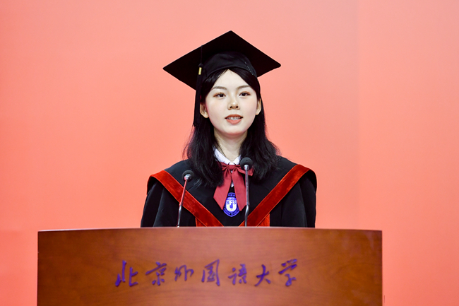 中华文化国际传播研究院硕士毕业生,来自波兰的刘艾琳作为留学生代表发言。她回顾了在中国的学习生活点滴与波兰家乡的情感连接,感谢北外为留学生提供的多语言的交流平台和多元的文化氛围,表达了自己对于中华文化的热爱,期待与同学们共同为"全球故事"和"未来故事"发出自己的声音。