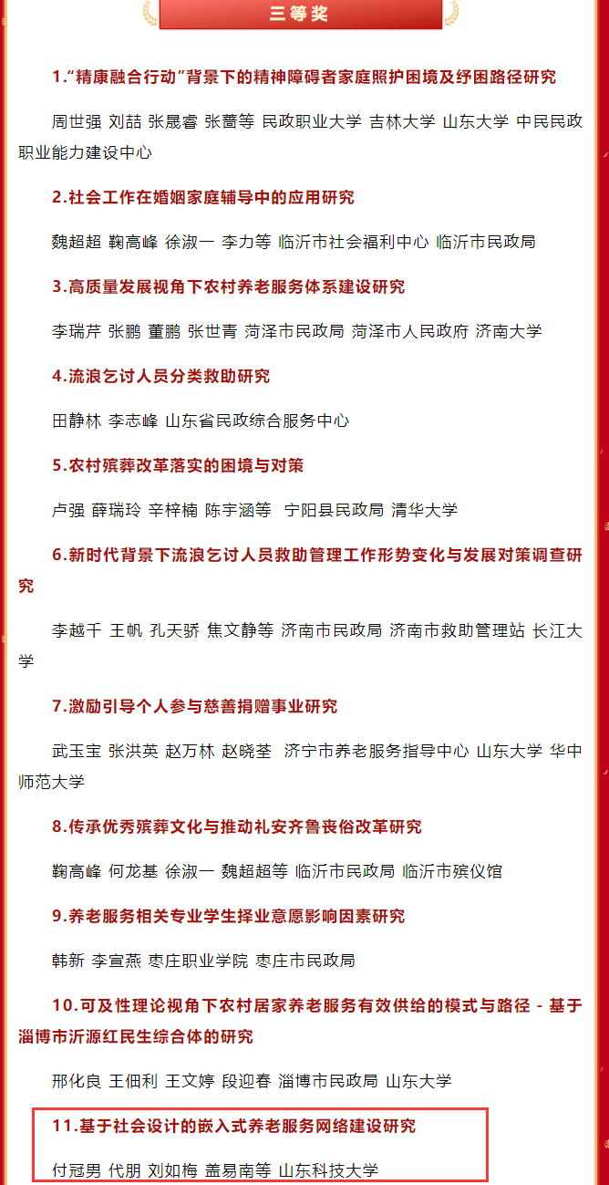 近日,民政部在北京举办2024年“全国民政论坛”,民政部党组书记、部长陆治原出席论坛并讲话。本次论坛公布了2024年民政政策理论研究获奖名单,beat365付冠男、代朋、刘如梅、盖易南等完成的“基于社会设计的嵌入式养老服务网络建设研究”荣获三等奖(beat365官方网站为第一单位)。