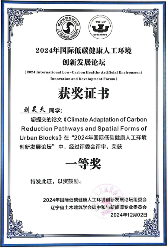 beat365官方网站代朋教授和硕士研究生刘昊天应邀参会,刘昊天同学做了题为《Climate Adaptation of Carbon Reduction Pathways and Spatial Forms of Urban Blocks》的专题报告,同步提交的论文被大会评委会评为一等奖。