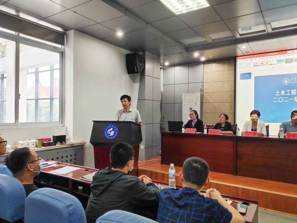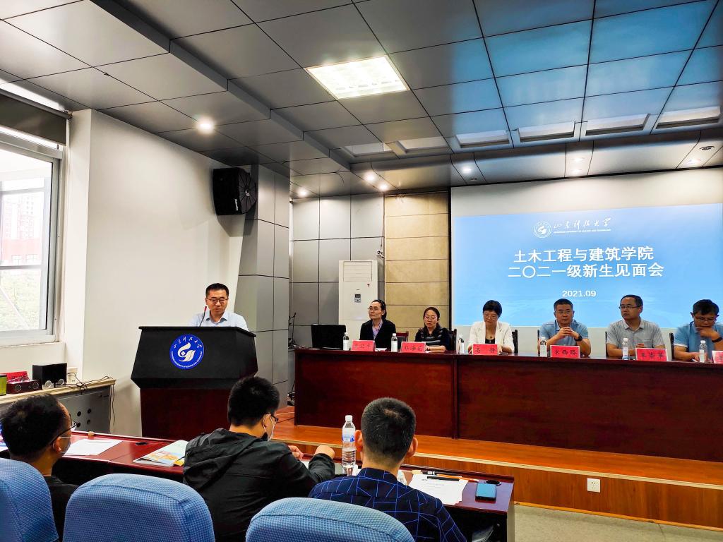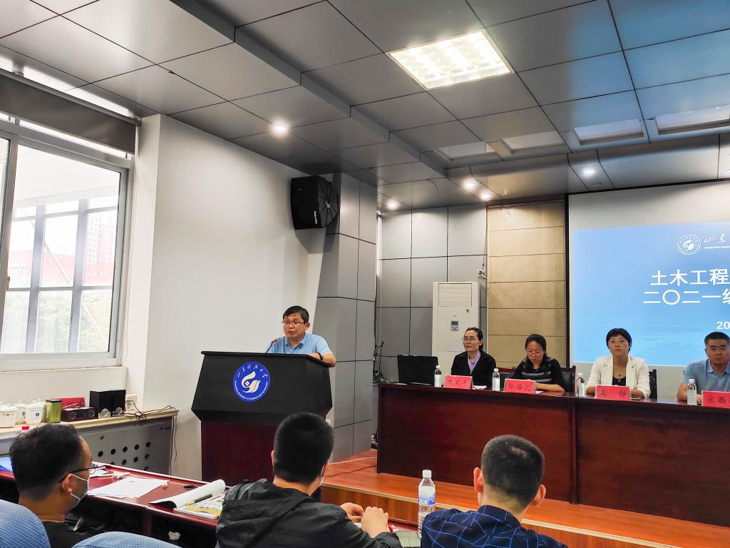 王崇革代表学院向新生的到来表示热烈欢迎,向新生介绍了土建学院的历史底蕴、师资力量、学科实力和研究生培养情况。鼓励新生结合自身实际情况,做好科学研究和学科实践,奋力争先,与学院共发展。