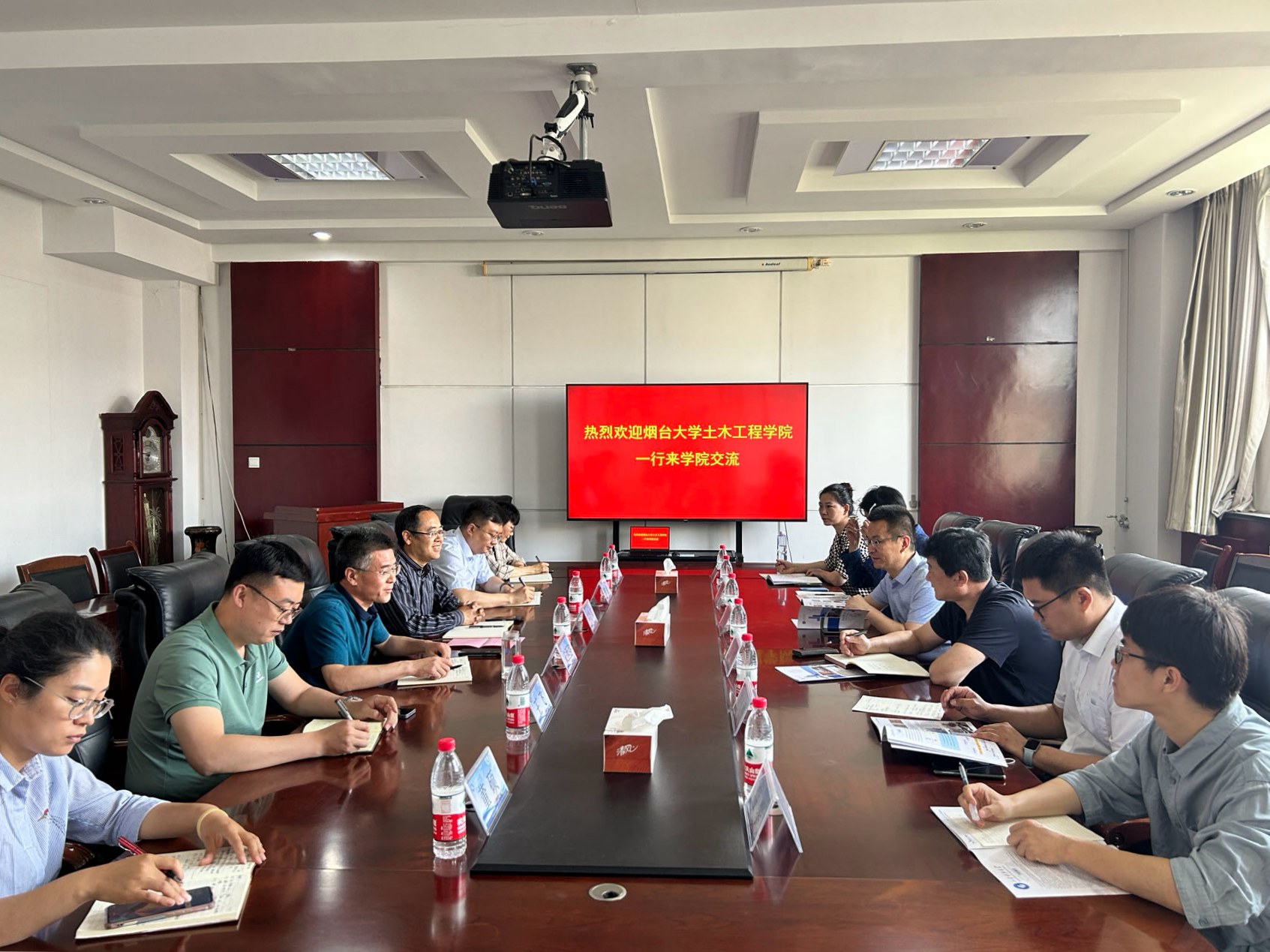 近日,烟台大学土木工程学院党总支书记曲峰、副院长吉植强、土木工程系主任刘人杰、岩土教研室主任王丹丹、温攀老师、张亮老师一行到访土建学院调研交流。土建学院党委书记宋西路、院长王崇革、副院长李朋、建筑工程系主任王飞及部分系所老师参加座谈会。座谈会由宋西路主持。