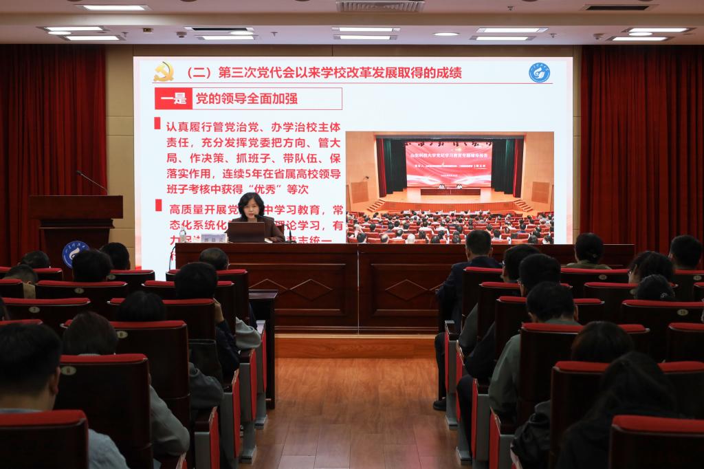 郭益灵从学校第四次党代会基本情况、会议的重要意义和主要成果、会议的主要精神和确保第四次党代会精神落实见效等方面进行了深入解读。她指出,学校第四次党代会全面总结了学校第三次党代会以来取得的成绩和宝贵经验,深刻分析了学校事业发展面临的机遇和挑战,确立了“一三六八十”的战略布局和任务举措,要按照锚定“一个目标”,坚持“三步走”,实施“六大战略”,迭代“八项任务”,升级“十大工程”的战略布局,谱写beat365官方网站高质量跨越式发展新篇章。