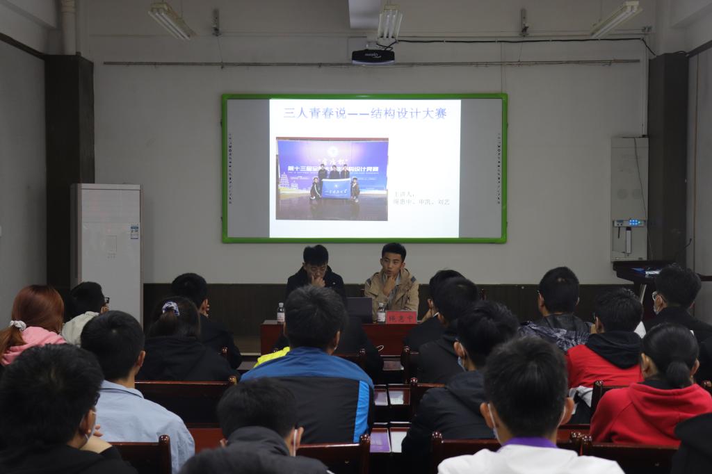10月29日下午,土建学院在J15-201顺利举办了“三人青春说”之结构设计大赛经验分享论坛活动。本次活动由绳惠中、刘艺、申凯三位优秀学生担任主讲人。