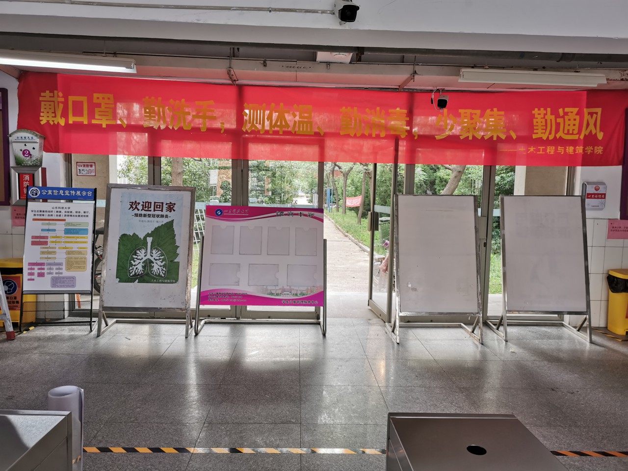 此外,学院辅导员们精心在宿舍楼周围和内部张贴疫情防控宣传海报和条幅,每个宿舍安置专属门牌,为返校学生准备了温暖包,配备绿植、洗手液、牛奶、水果,以及辅导员亲笔手写的寄语卡,希望返校的土建学子们尽快适应疫情防控常态化下的校园生活。