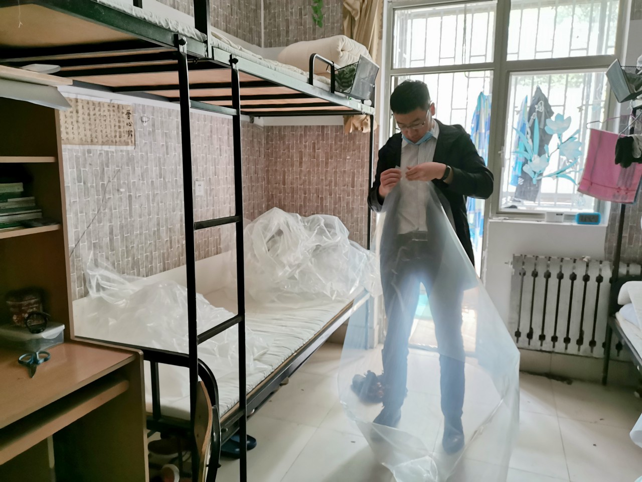 土建学院团委对返校学生进行全面摸排,建立返校学生信息台账,一人一策进行精细化安排。考虑到宿舍较分散不利于学生安全和学校管理的情况,学院将本科生宿舍进行整合,男生统一安排在GB2一楼。近一周,学院全体辅导员集思广益,拟定宿舍准备方案,随后马不停蹄,对征用的9个整合宿舍进行整理、打扫、消毒。辅导员们将整合宿舍原成员的被褥、衣服进行打包收纳,书架物品进行归置并封存,衣柜使用封条封住,开窗通风,清理垃圾,既最大限度的保障宿舍原成员物品的安全,又全力为新入住的同学提供干净整洁的居住环境。学院在每个宿舍都放置了《致全体返校学生的一封信》《学生宿舍卫生消毒通风测温记录表》《返校学生轨迹记录表》等材料,每个宿舍均安排舍长统筹负责返校后的体温测量、消毒通风、晚点名等各项事务。