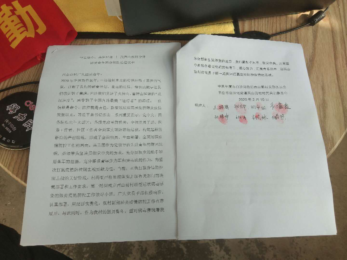 村口道路执勤的值班制度是轮班制。在不需要到执勤的时间里,初安妮和其他大学生志愿者一起主动承担了新冠肺炎的知识普及工作。他们向村民们科普新冠肺炎相关知识,为大家讲解口罩的重要性和正确佩戴方式,提醒路上没戴口罩的村民回家戴好口罩……她还在《坚定信心,共克时艰——致西山前村全体团员青年的疫情防控倡议书》上签下自己的名字。