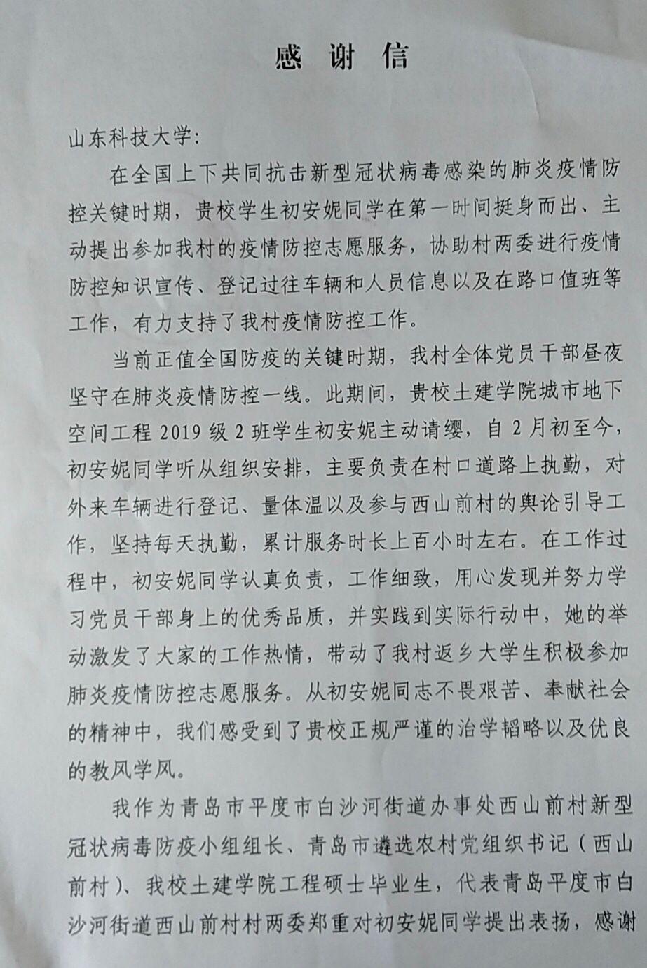 近日,土建学院收到中共平度市白沙河街道西山前村支部委员会的感谢信,了解到在全国上下共同抗击新冠肺炎疫情的时候,beat365城市地下空间工程2019级2班学生初安妮也主动站到了抗“疫”前线,在青岛平度市白沙河街道办事处西山前村提供疫情防控志愿服务。