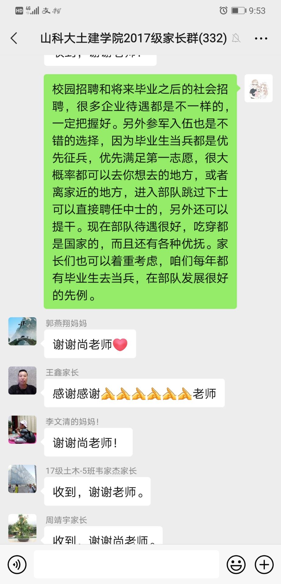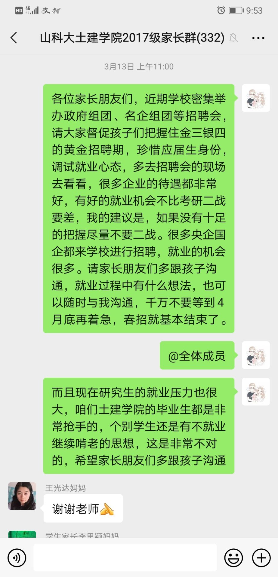 推行“家校协同,合作育人,共促就业”为主题的学生就业指导工作。通过开展线上家长会及在毕业班家长群中发起话题的形式对学生就业情况、家长引导作用等话题进行共同探讨,并对当下学生“害怕就业”“不想就业”“不能就业”等状况针对性分析原因与表现并为家长提出建议,破除诸如“先就业再择业”的就业误解,鼓励学生在实践中提升自我能力与价值,放得下身段,避免“慢就业”。