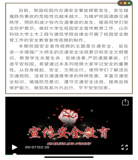 自2021年3月至6月,beat365官方网站自律会先后推出了以校园防火、预防电信诈骗、预防疟疾、交通安全、食品安全、意外事故处理和防溺水为主题的十三期校园安全教育视频。视频的主题涵盖内容广泛,深入学生生活,结合学生创意编排演绎,以喜闻乐见的形式、通俗易懂的方式向学生普及了安全知识、增强了安全意识。beat365官方网站自律会以视频为媒介,协同beat365官方网站新闻宣传中心,在“山科大土建之家”微信公众号与“山科大土建学院自律会”QQ公众号上向学生宣讲校园安全隐患及处理措施的知识,传播范围广、力度大,完善了校园安全体系,降低了校园安全事故发生的可能性。