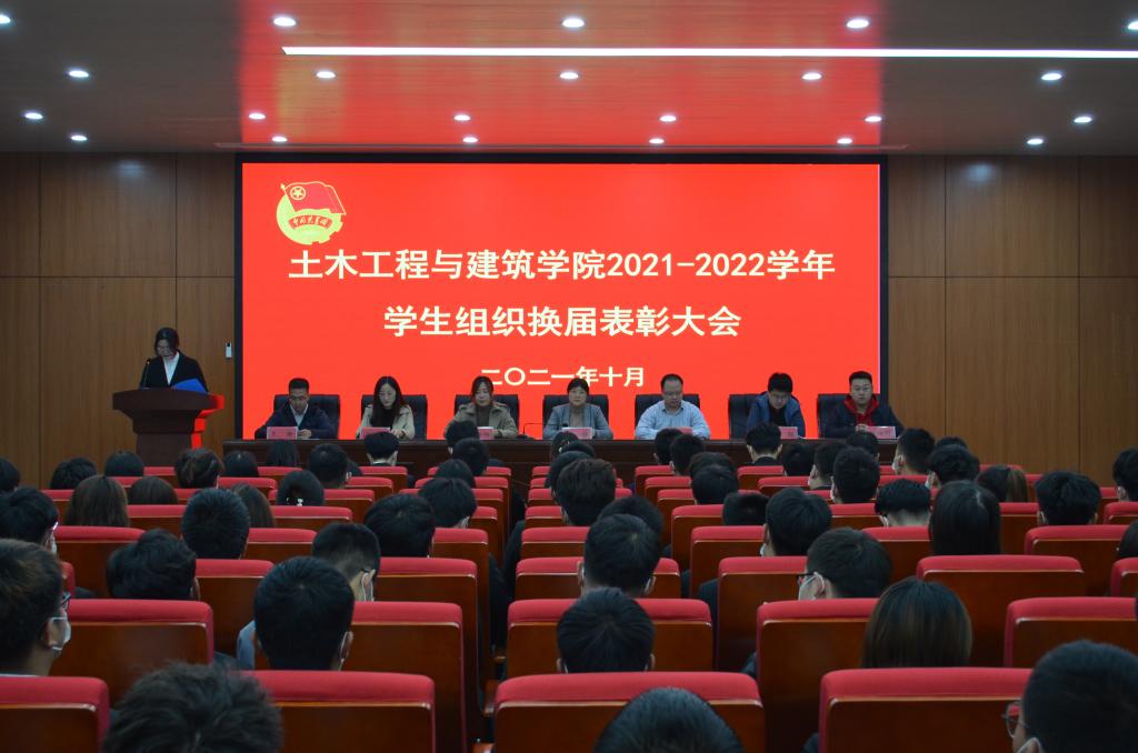 10月26日,土建学院2021-2022学年学生组织换届表彰大会在J15-136报告厅召开,土建学院党委副书记、副院长高静,学生工作办公室主任朱统汉,辅导员老师刘超、鲍娜娜、刘泽群、沈娇、王瑜,优秀学生干部、优秀志愿者代表和新一届学生组织成员参加会议。会议由2021-2022学年学生会主席团成员刘晓玉主持。