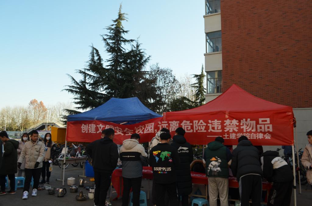 为增强同学们的安全意识,提高同学们对安全防范的认知水平,营造和谐安全的校园环境,11月23日下午,土建学院自律会在B2-B4宿舍楼前开展“创建文明安全校园,远离违禁危险物品”安全教育主题活动。学生工作办公室主任朱统汉、辅导员刘超到场进行了细致的指导,传达了学校安全工作精神。