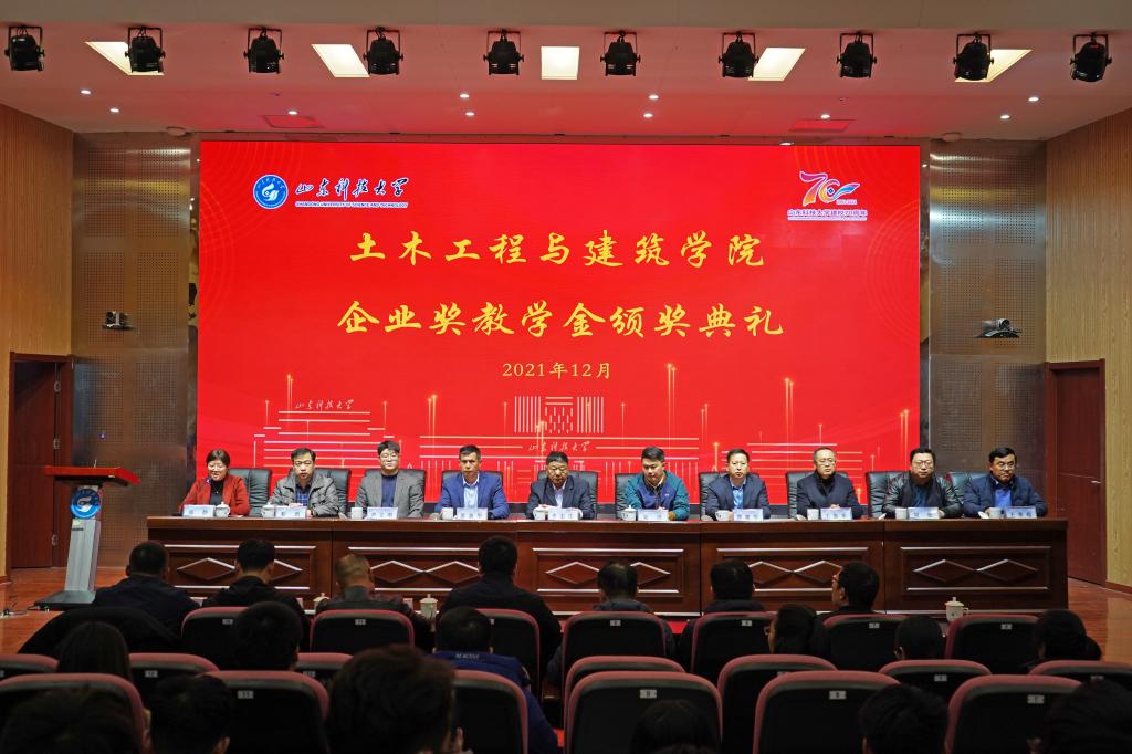 12月19日,土建学院企业奖教学金颁奖典礼在J9-144报告厅举行。山东华滨建工有限公司党支部书记李志连、烟台平安信息工程职业技能培训学校校长宋洋、日照市政集团常务副总经理娄善华、山东省路桥集团青岛分公司党总支书记曹建军、校团委书记尹立明、学生工作处副处长靳凯、研究生工作部副部长刘松、合作发展处副处长王荣超、土建学院师生代表参加了本次颁奖典礼。典礼由土建学院党委副书记高静主持。