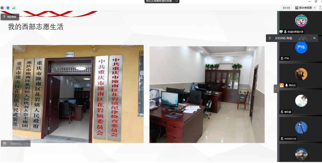 为进一步做好西部计划的宣传动员、招募选拔工作,弘扬志愿精神,转变学生的择业就业观念,引导大学毕业生到西部、到基层、到祖国最需要的地方建功立业。4月18日,土建学院于J15-219会议室举办“志愿西行 追梦青春”西部计划宣讲活动。本次宣讲会邀请到2020届新疆西部计划志愿者孙真真和2021届重庆西部计划志愿者陈慧担任主讲,会议由团委书记朱统汉主持,本科和硕研有意向参与西部计划志愿的学生参会。