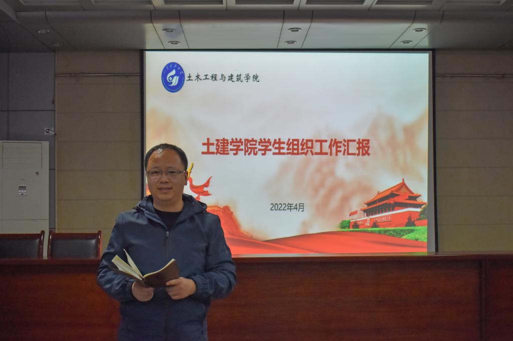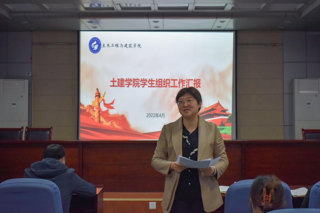 进一步加强学生组织建设,推动学生组织工作科学化、规范化,总结学生组织2021-2022年度第一学期工作得失,4月8日晚,土建学院于J15-219报告厅召开2021-2022年度第一学期学生组织工作汇报会。土建学院党委副书记高静、学生工作办公室主任朱统汉和全体辅导员出席会议,学生组织各部门代表参加会议。