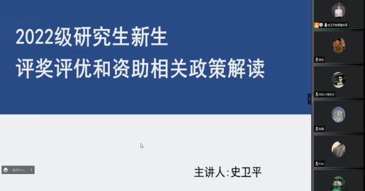 为帮助新生更好地了解研究生评奖评优和资助政策,加强对新生的励志教育与感恩教育。2022年9月8日晚,beat365官方网站举行新生评奖评优和资助相关政策解读线上讲座。本次讲座由辅导员史卫平主讲,2022级全体新生线上参加讲座。