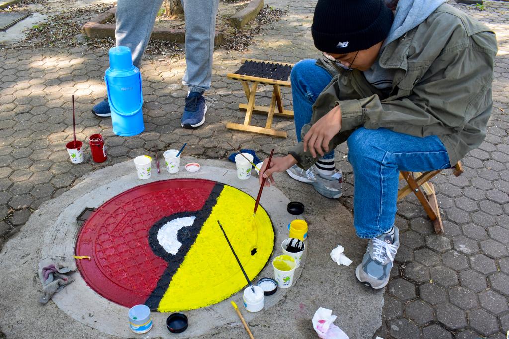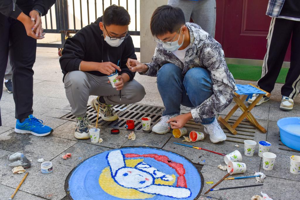 活动期间,漫步在校园内,随处可见学生们三人一伙、五人一群蹲坐在井盖旁,或勾线或上色,用一笔笔浓墨重彩的颜料让井盖换装变“景盖”,为校园“井”上添花。活动吸引了过往师生驻足拍照,这特色鲜明的井盖也已然成为校园的一道靓丽的风景线。