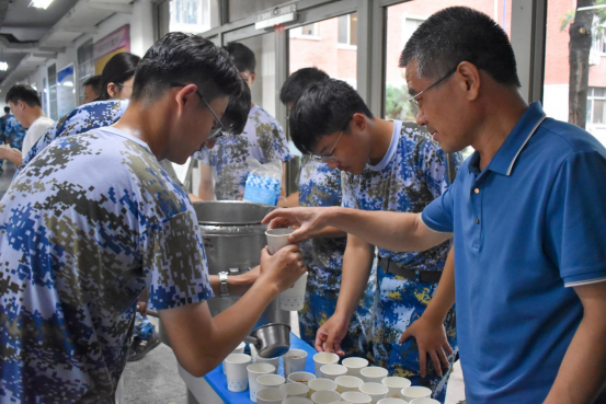 在各班级负责人的组织下,学院2023级新生们有序排队前往宿舍楼下领取姜茶,学院党委书记宋西路、党委副书记高静、学生工作办公室辅导员们将温热的姜茶递给同学们。宋西路勉励新生们要发扬吃苦耐劳精神,为自己未来四年的学习生涯系好第一粒扣子,把军训中的优秀品质延续到日后的学习和生活中去。有一位同学接过姜茶时说:“感谢学院领导和老师们的暖心关怀,能够来到山科、来到土建学院真是既幸运又幸福。”