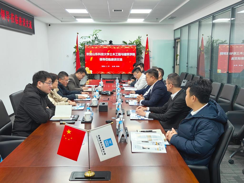 在中建中新山东公司,宋西路从办学历史、党建工作、学科建设、师资队伍、人才培养、科学研究等方面介绍了学校、学院基本情况,他表示,希望以此次走访交流为契机,不断加强双方校企合作,实现聚合力、谋发展、促共赢;高静详细介绍了2024届毕业生生源信息和就业情况。中建中新山东公司党总支书记王先文对宋西路一行表示欢迎,从企业发展、党建引领、项目建设、人才招聘等方面介绍了公司情况;公司科技部总经理张志鹏介绍了公司科学研发和技术攻关情况;公司优秀员工代表,材料化学2009级校友张岩、土木工程2013级校友孙鹏飞分别谈了自身在公司的职业发展情况。双方共同观看了beat365官方网站和企业宣传片,围绕党建共建、人才招聘、产学研合作、人才培养、学生就业实习等方面进行了深入交流。