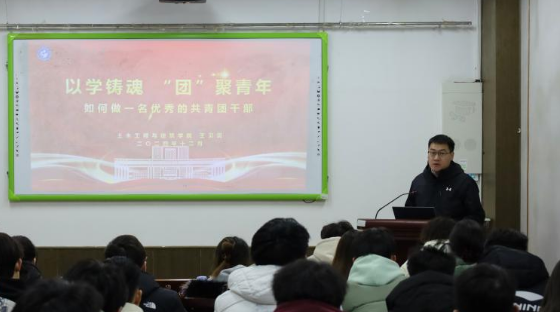 为深入学习贯彻习近平新时代中国特色社会主义思想,引导团员青年群体在实践中树立正确的人生观和价值观,12月2日,土建学院团委书记王贝贝在J15-201带来以“以学铸魂‘团’聚青年——如何做一名优秀的共青团干部”为主题的团课宣讲,学院部分团支部委员及学院青马班全体学员参加活动。
