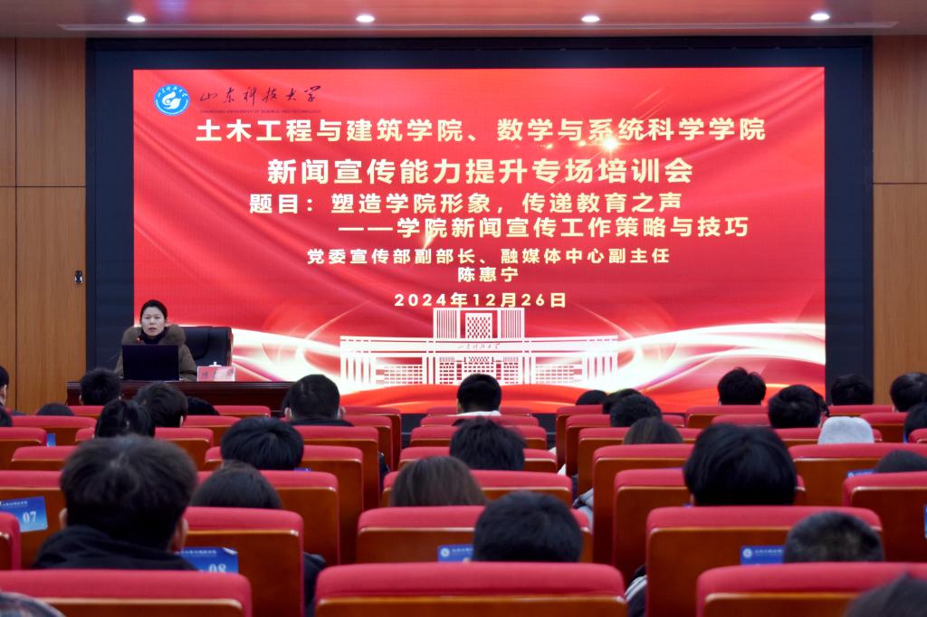 为进一步加强学院宣传队伍建设,提升新闻宣传工作水平,12月26日,土建学院与数学学院于J15-136报告厅联合举办了新闻宣传能力提升专场培训会,本次培训会邀请校党委宣传部副部长、融媒体中心副主任陈惠宁和《山东科大报》编辑、校党委宣传部韩洪烁老师分别作报告。学院新闻宣传中心成员及各班级宣传委员参加此次培训会,培训会由土建学院学生工作办公室主任、团委书记王贝贝主持。
