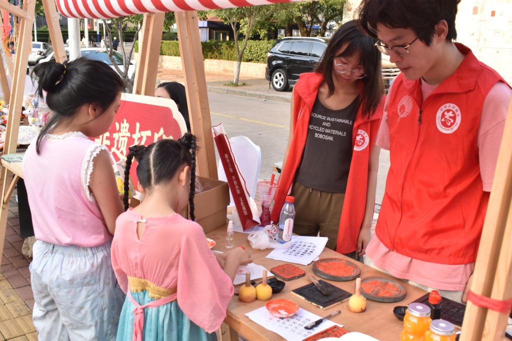活动现场,漆扇工艺展位前,非遗传承人耐心讲解着“三涂九染” 的古老技法,学生们跟随讲解,小心翼翼地握着画笔,在扇面上勾勒出简单的云纹。青瓷茶具在茶盘上排列有序,同学们正跟着志愿者们学习,一步步体验乌龙茶的冲泡流程:温杯、置茶、注水、出汤,每个动作里都透着好奇。这些传统工艺不仅具有观赏价值,更蕴含着深厚的文化内涵,让同学们在轻松愉悦的氛围中,真切感受到了传统文化的独特魅力。