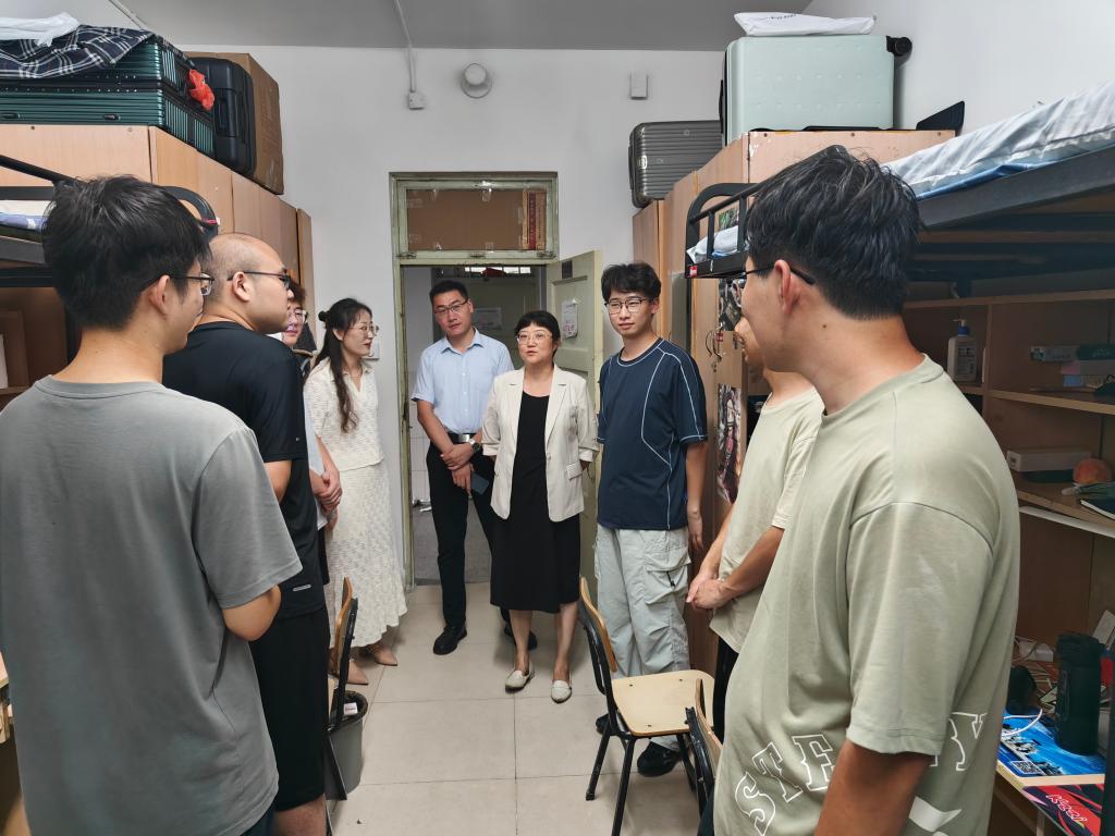 迎新期间,校领导亲临土建学院迎新现场指导工作,细致了解各项迎新工作进展情况,对现场志愿者表示慰问。土建学院党委书记宋西路、院长王崇革等学院领导来到报到现场查看新生报到情况,并与新生及家长亲切交谈,详细了解新生的报到情况与需求,并勉励同学们以良好的精神面貌迎接崭新的校园生活,尽快融入土建温馨、积极、向上的大家庭。随后,学院领导及新生辅导员前往GB2公寓楼,与新生们亲切交谈,询问大家的住宿体验、生活需求及入学后的适应情况,仔细查看宿舍的设施配备、环境卫生等细节,叮嘱同学们注意用电安全、做好个人防护,尽快熟悉校园环境,融入集体生活。