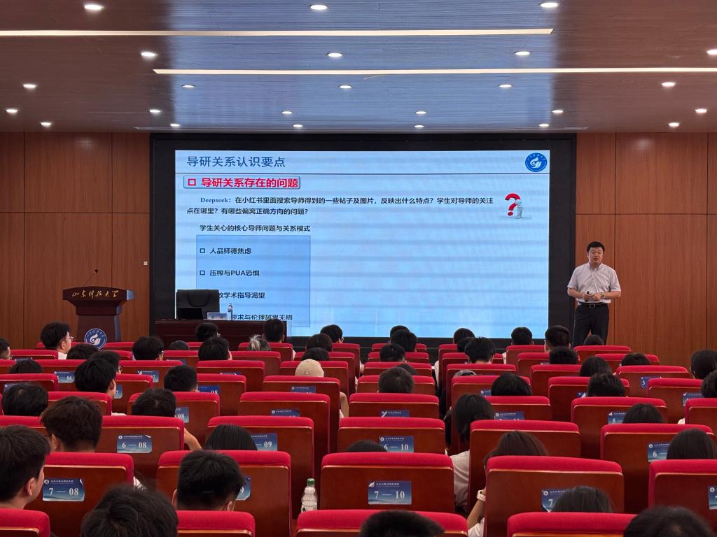 学院研究生辅导员沈娇以《恪守规范,安全同行——开启研究生新征程》为题,向同学们详细解读了学校的研究生奖助学金办法、学生违纪处分办法、考试违纪及作弊处分程序等,并结合实际案例重点强调了安全教育尤其是反诈骗教育的重要性,同时组织全体新生观看了山东省“开学反诈第一课”,引导新生严守校规校纪,守住安全底线。