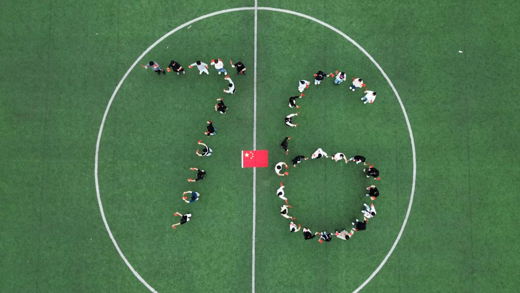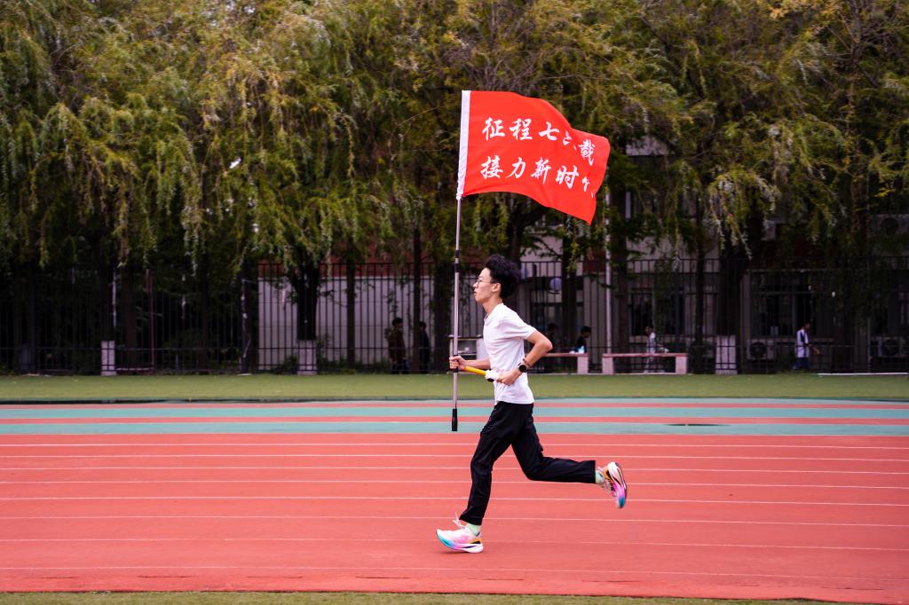 活动伊始,庄严的国歌奏响,全体人员面向国旗行注目礼,高唱国歌,工作人员有序奔向预定位置,以身躯为笔,以绿茵为卷,用充满活力的身影,精准地汇合、排列,瞬间定格为一个具象而辉煌的图案——“76”造型赫然呈现。随后,土建学院研究生辅导员史卫平发表致辞,她指出,今天的接力跑活动,既是对历史的致敬,也是对未来的展望,希望同学们能将爱国之情、强国之志转化为报国之行,奔跑出属于自己的青春。本次接力跑从象征1949年新中国成立的起点出发,参赛选手们以400米、800米为赛段依次接力,用脚步丈量热忱,用汗水诠释担当,从1964年第一颗原子弹爆炸成功,到1978年改革开放的伟大转折;从1997年香港回归的民族欢腾、2008年北京奥运会的无上荣耀,再到2020年脱贫攻坚全面胜利的伟大奇迹……选手们奔跑的每一步都凝聚着对祖国的深情告白。