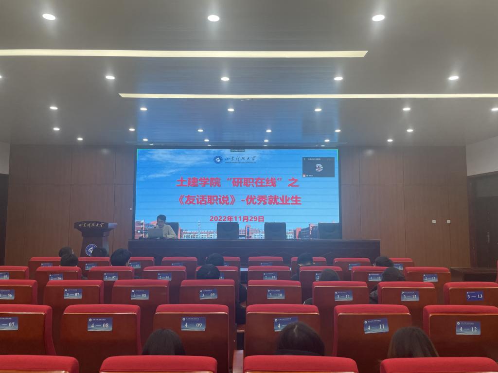 为引导学院学生做好职业生涯规划,提高毕业生就业竞争力。11月29日,由校团委主办,土建学院承办的“研职在线”系列活动之“友话职说”就业经验分享会在J15-136会议室举办。本次活动邀请到巩越、吴迪两位优秀毕业生分享就业经验,会议由郑驿凯主持。