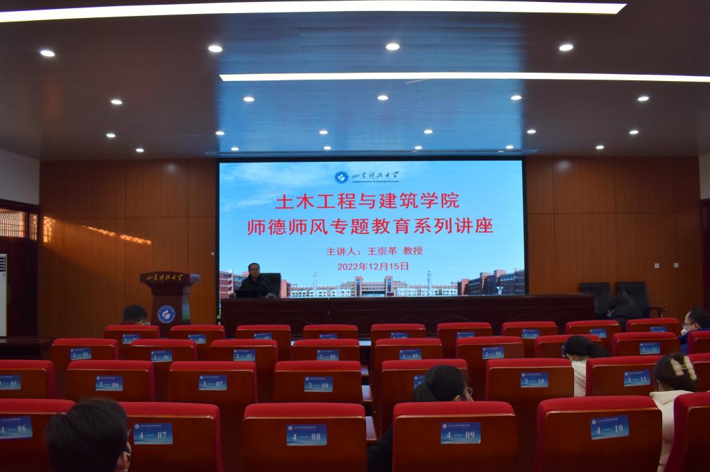 为认真学习贯彻党的二十大精神,落实立德树人根本任务,根据《beat365官方网站师德专题教育实施方案》文件精神,结合学校教务处青年教师助课和青年教师教育教学导航计划文件精神要求,强化每一位青年教师的立德树人意识,着力提升学院青年教师的教育教学水平,近日,土建学院2022年“师德师风专题教育”系列讲座第四讲于J15-136报告厅举行。邀请到青岛市教学名师、土建学院院长王崇革教授担任主讲。学院40岁以下和近三年入职青年教师参加了此次讲座,讲座由副院长李朋主持。