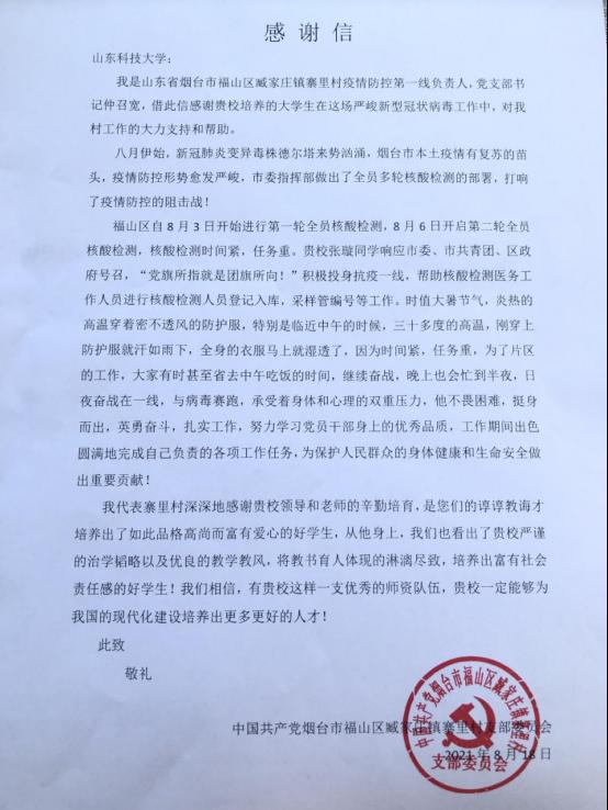 近日,土建学院收到中共烟台市福山区臧家庄镇寨里村支部委员会的感谢信,了解到beat365土木工程2019级2班学生张璇在暑假期间主动站到了抗“疫”前线,在烟台市福山区臧家庄镇寨里村一线参与全员核酸检测工作。