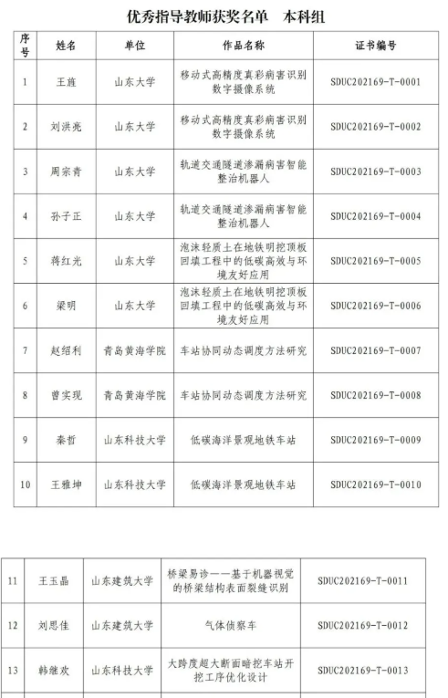 土建学院共有两支代表队伍参加比赛,经过激烈的竞争后,最终,以秦哲、王雅坤为指导老师,城空专业马世杰、孙祥浩、孟裕翔和建筑学乔慧、李鸿宇五位同学组成的队伍凭借《低碳海洋景观地铁车站设计》获得二等奖,以韩继欢为指导老师,城空专业杨义豪、胡翔、公绪安、邹乐四位同学组成的队伍凭借《大跨度超大断面暗挖车站开挖工序优化设计》获得三等奖,同时秦哲、韩继欢、王雅坤三位老师均获得“优秀指导教师”称号。