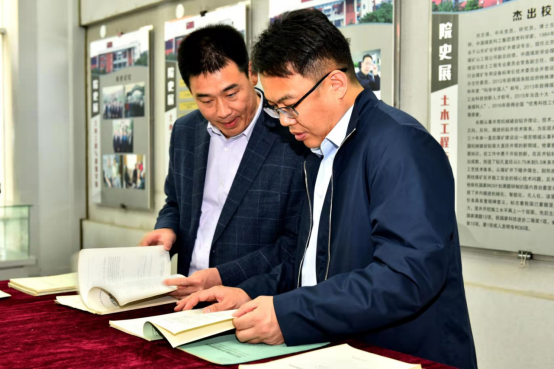 随后,杨小林一行来到土建学院,参观了陈子荫先生塑像、土建学院院史展,翻阅了陈子荫先生生前保留的许多著作、论文、手稿等原件。王崇革为来宾介绍了学院的发展历程、学科和专业建设及杰出校友。来宾对以陈子荫先生为代表的冯豫、周文安、胡峰等老一辈专家学者集体对山科大矿井建设学科发展奠定了坚实的基础表达了敬意。之后,杨小林一行深入学院土木工程实验中心调研。