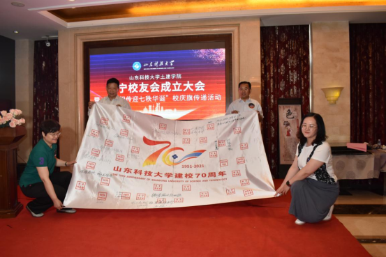 在“薪火相传迎七秩华诞”校庆旗传递活动中,滕州校友会会长王宠、外语学院济宁校友会会长常黎黎分别致辞,滕州校友会代表将校庆旗传递给济宁校友会代表,徐炳辉和常黎黎分别在校庆旗上写下对母校70华诞的诚挚祝福。